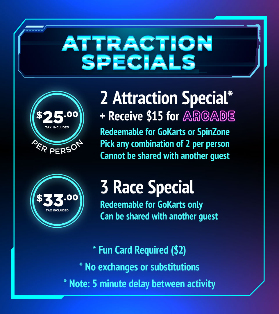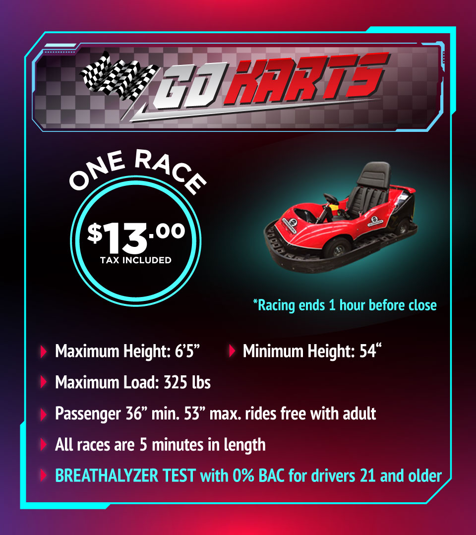 Please note our zero-tolerance policy. All drivers 21 years of age or older are required to pass a BREATHALYZER TEST. Management will maintain a ZERO TOLERANCE policy on failure to comply with the above rules and proper etiquette. Make our NasKart experience track your first pit stop at Livingston’s, then drive on to more fun with other activities.